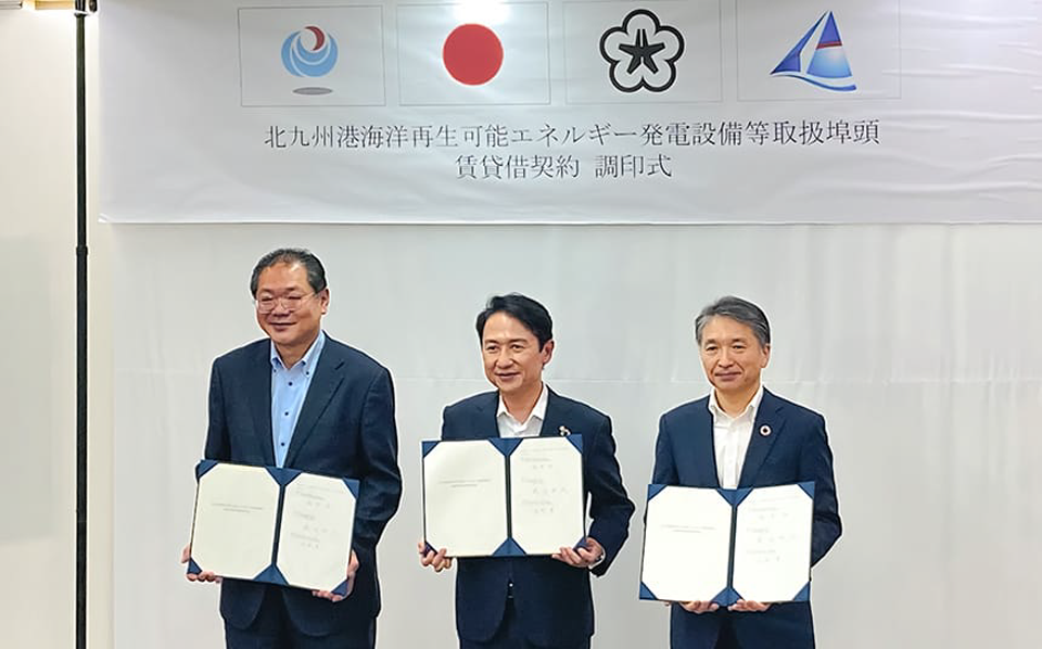 本日、北九州市役所において、国土交通省九州地方整備局と北九州市、そして当社は、港湾法に基づく「北九州港海洋再生可能エネルギー発電設備等取扱埠頭(基地港湾)賃貸借契約」を締結しました。