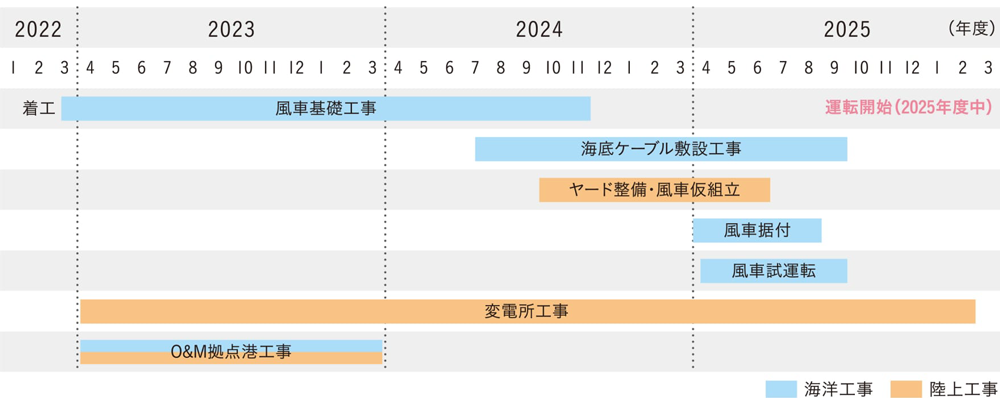 当社は、今後、基地港湾において、風車部材の受入、仮組立等を行い、2025年4月以降、海洋において風車据付、試運転を行い、2025年度中の運転開始を目指します。