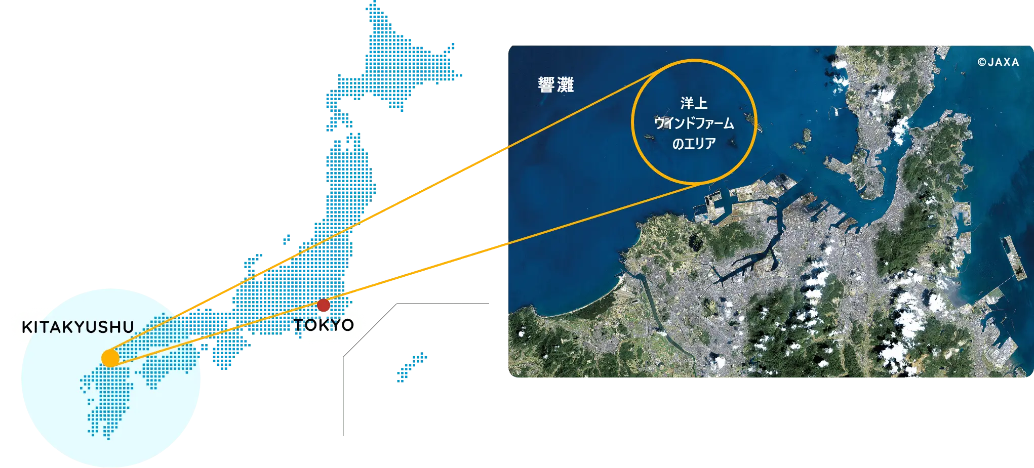 北九州響灘洋上ウインドファームは、北九州市若松区沖の響灘において、南北1〜10km、東西11kmの海域に設備容量9,600kWの大型風車を25基設置し、最大出力22万kWの発電所として、20年間にわたり発電事業を行うものです。
