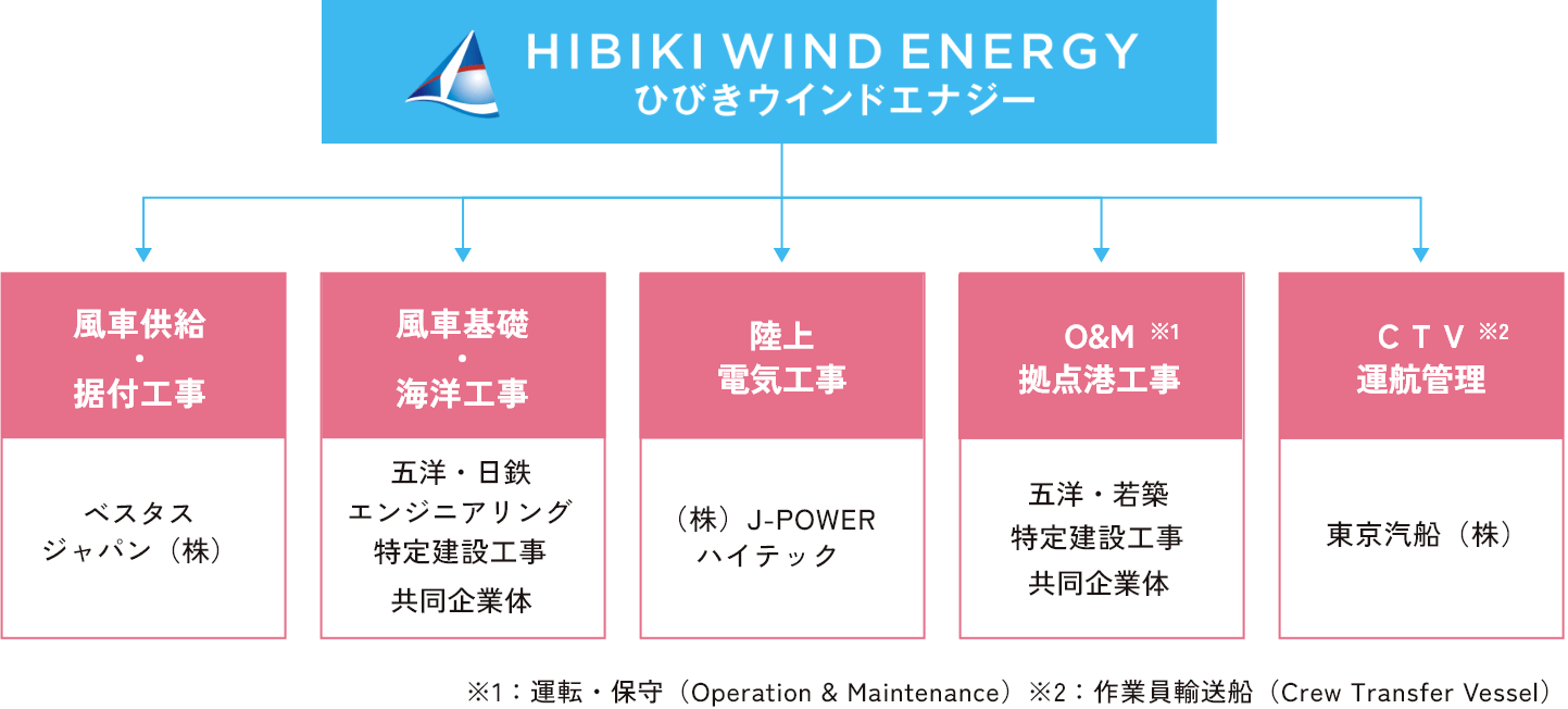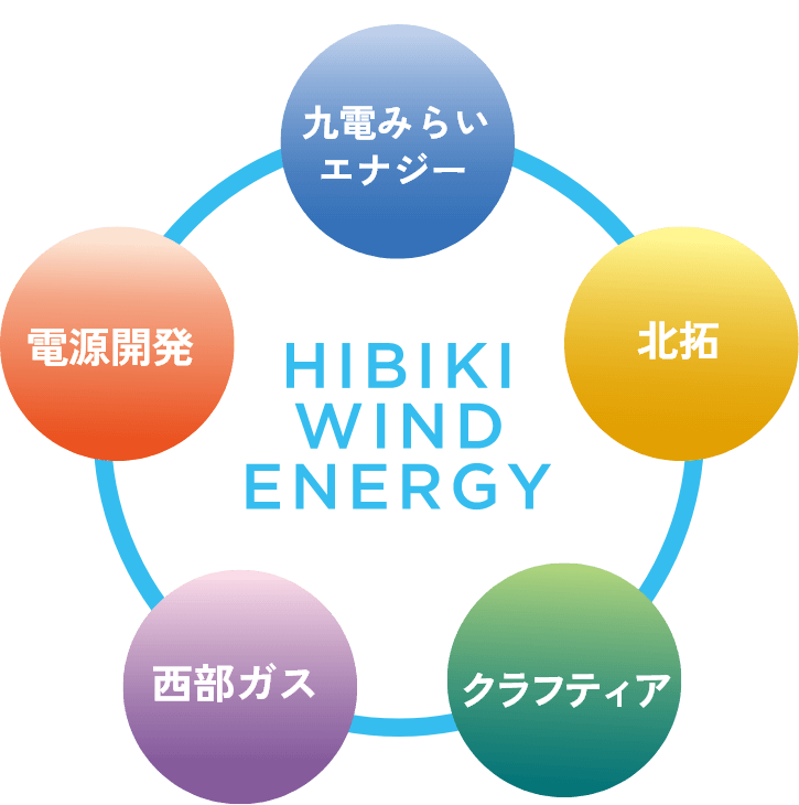 ひびきウインドエナジー(株)は、九電みらいエナジー(株)、電源開発(株)、 北拓(株)、西部瓦斯(株)、(株)クラフティアの5社により構成する事業会社です。 『地域と歩む洋上ウインドファーム』を目指して、本ウインドファームの建設、運用及び維持管理を行います。