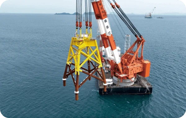 大型起重機船でジャケット式基礎を吊り上げたまま据付場所まで海上運搬。あらかじめ打設した鋼管杭上にジャケットを据え付けました。