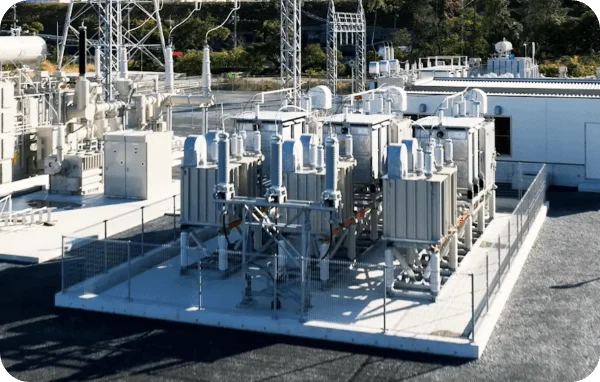 洋上の風車から海底ケーブルを通じて送られてくる電気を陸上の変電所で変圧・調整。変電所・送電線を介して電力系統に接続しています。