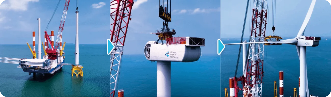 基地港湾で仮組立(プレアッセンブル)を行い、一航海あたり3基分の部材をSEP船に積み込み。設置場所にSEP船を曳航後、風車基礎の上にタワー、ナセル、ブレードの順に据え付け。2025年8月、25基の風車の据え付けが完了しました。