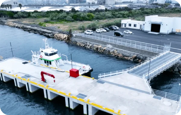 洋上ウインドファームの運転・保守を担うCTV(作業員輸送船)。O&M拠点港にCTVを係留する桟橋や事務所・倉庫を整備しました。