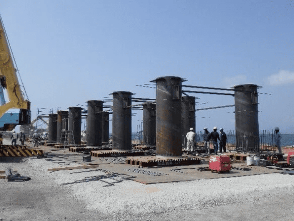 国内の桟橋上部工のコンクリートは海上に型枠を組んで製作する「現場打ち」で作られることが多いですが、コンクリートの品質向上をねらって本工事では海上に比べて製作が容易な陸上であらかじめ製作する「プレキャスト工法」を採用しています。