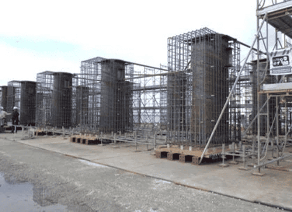 その後、写真1や写真2のように、鞘管の周りに鉄筋や型枠を組んで、打設の準備を行いました。