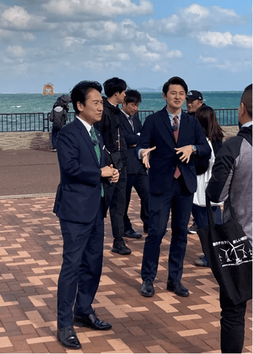この日は、晴天にもかかわらず、折からの強風と高波で、時々、海水の飛沫を浴びながらの視察となりましたが、工事の順調な進捗と北九州からカーボンニュートラルへの新たな挑戦が始まっていることを実感いただいたものと思っています。