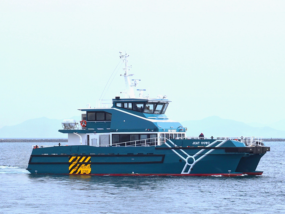 「JCATひびきⅡ」は昨年就航した「PORTCATひびき」と同じ双胴船型のCTVであり、厳しい気象・海象条件の下でも洋上の風力発電所に作業員を安全に移乗させることが可能です。