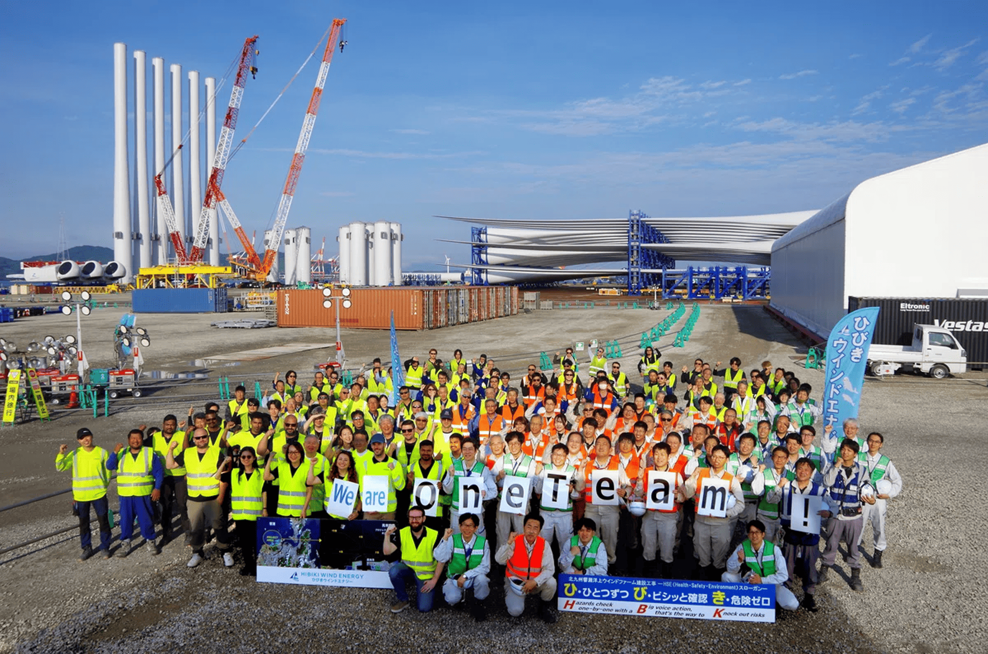 私たちプロジェクト関係者は、北九州市若松区沖の響灘において建設中の「北九州響灘洋上ウインドファーム」の2025年度中の運転開始に向け、一丸となって取り組んでいます!